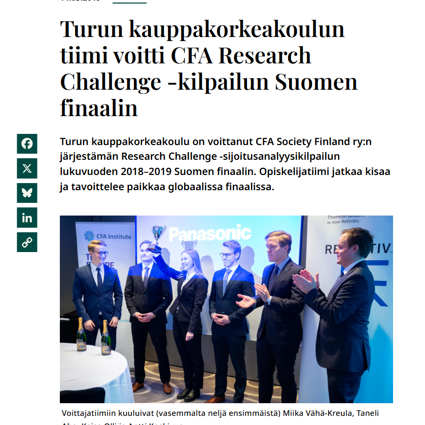 CFA Research Challenge Suomen finaalin voittaja.